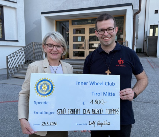 Ein weiteres Beispiel ist gemeinsam mit Don Bosco die Finanzierung eines Internatsplatzes in der HTL Fulpmes. „Ich bin dankbar, dass Inner Wheel Club Tirol Mitte sich für Bildung einsetzt und Mädchen in besonderer Weise fördert“ unterstreicht Schülerheim-Direktor Peter Rinderer bei Übergabe des symbolischen Schecks in Höhe von € 1.800,–.