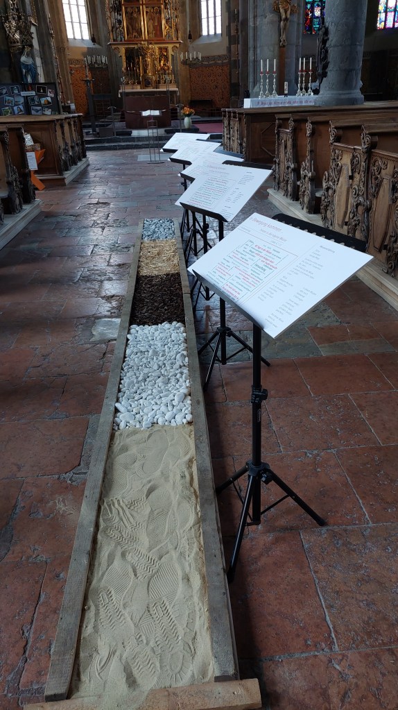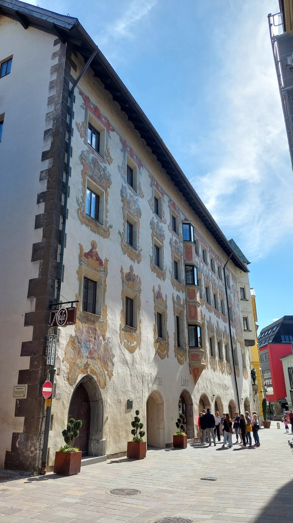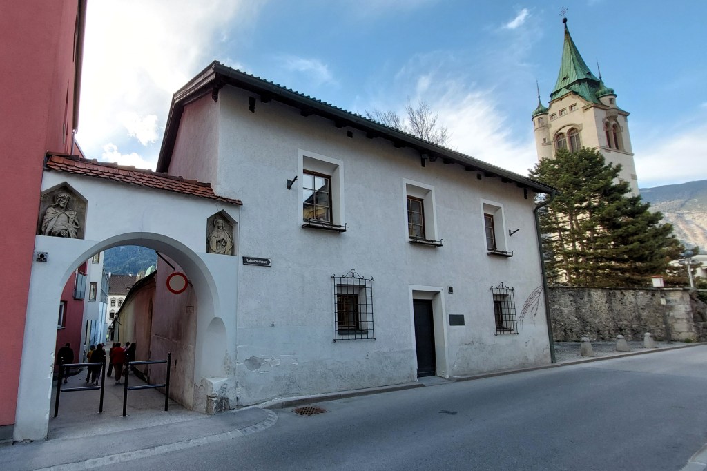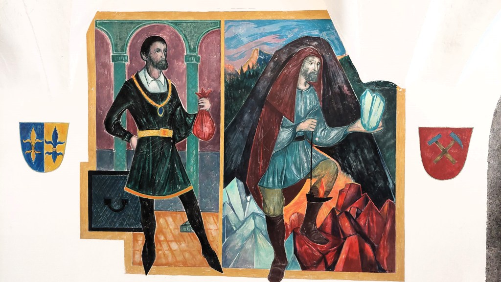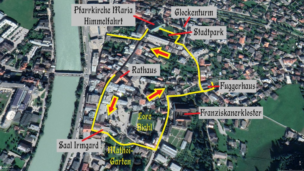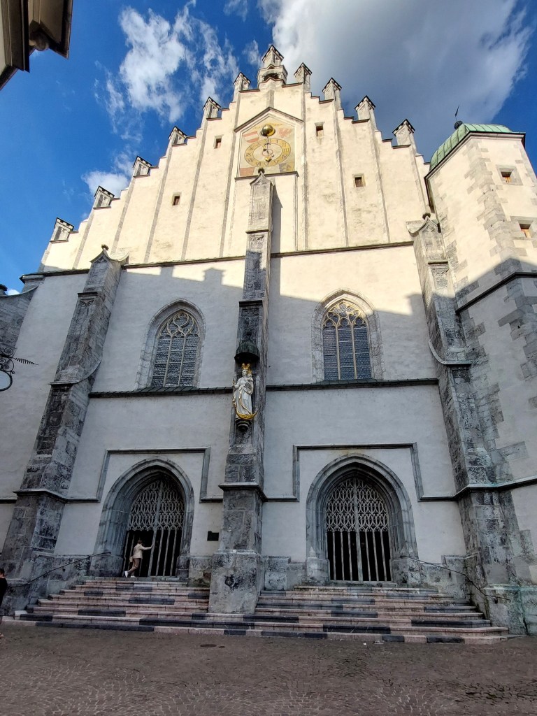 Der Treffpunkt war um 15 Uhr vor dem Rathaus. Nach einer kurzen historischen Einführung führte uns Herr Winkler zu einigen der geschichtsträchtigsten Orte der Stadt: zum Mathoihaus, in den Kreuzgang des Franziskanerklosters, in den Garten des Fuggerhauses (heute im Besitz der Tertiarschwestern) und schließlich in die beeindruckende Pfarrkirche Schwaz, wo sich das Grabmal der Fugger befindet.